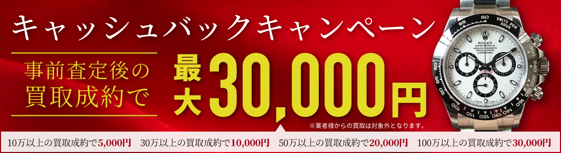 ・ 事前査定後に100万以上の買取成約で、買取金額に30,000円の上乗せにてキャッシュバック