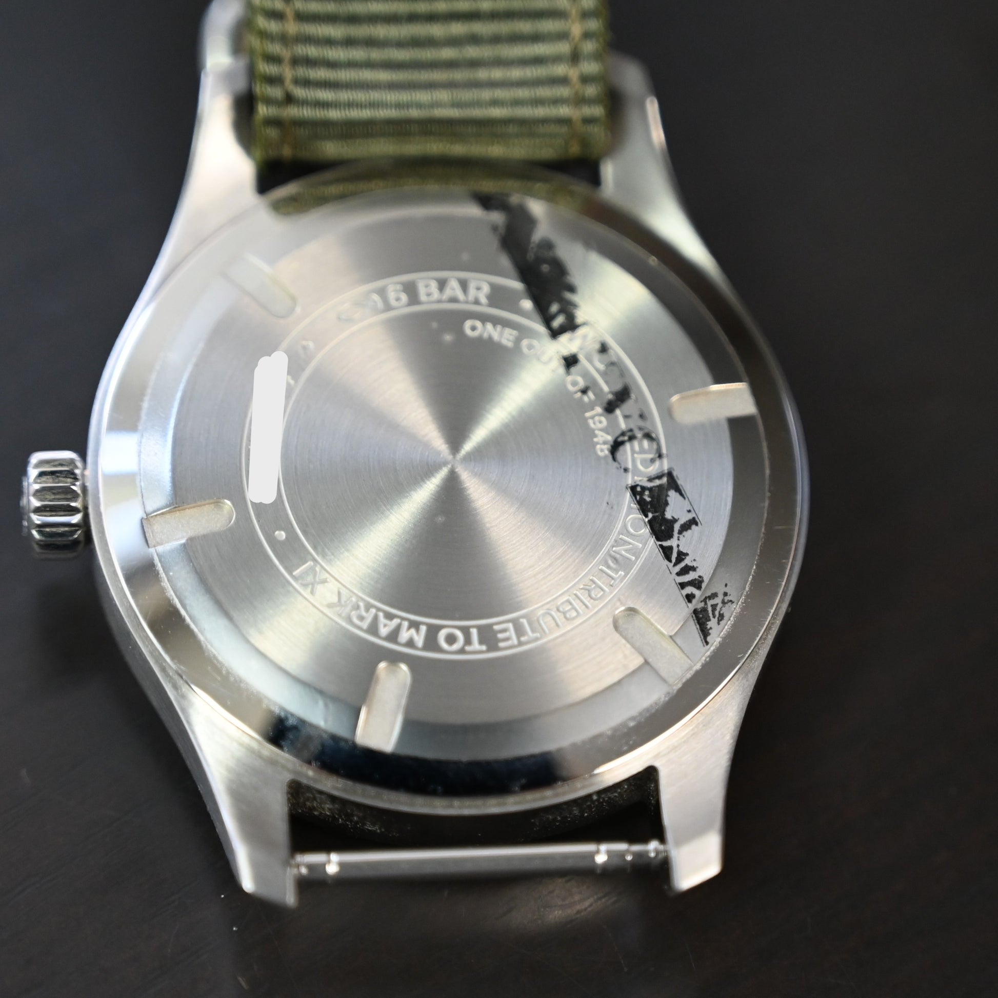 イギリス軍の要請により、パイロットの支給品として生産された「マーク11」のトリビュートモデル ヴィンテージ感溢れる文字盤に当時のNATOバンドを再現されたもので マニア垂涎モデル 限定1948本 2018年7月販売された 国内正規の使用感の少ない極美品 裏蓋保護シールも貼られた状態 特筆するような傷もありません。 日差は平置きでプラス6秒程