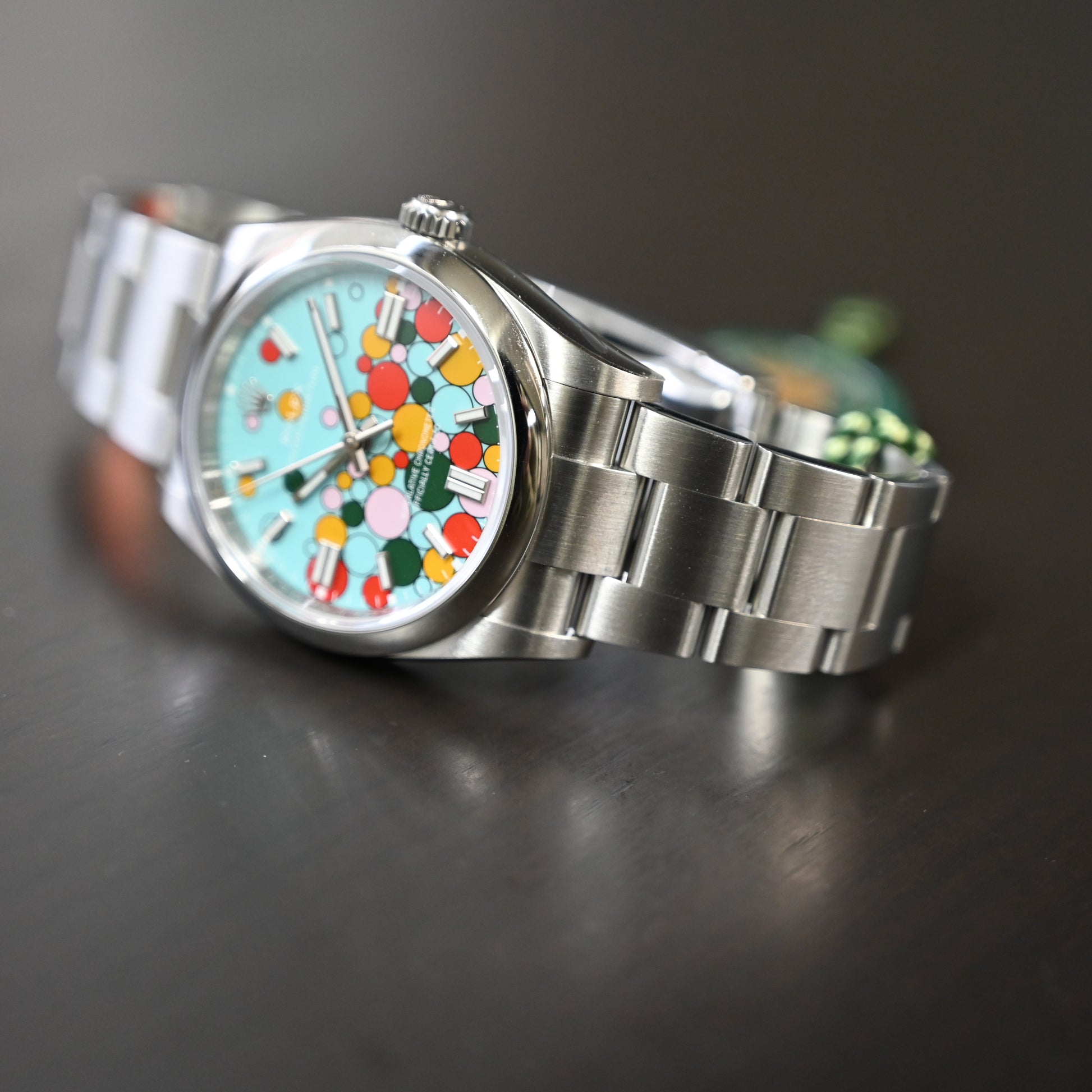 セレブレーションダイヤルの36㎜サイズ 昨今のロレックスのアーティスティックなモデルを発表しており。今年生産終了なったレアモデル 日差もプラス3秒程(平置きで) 保護シールも一部残ってます 新品で2024年11月保証書