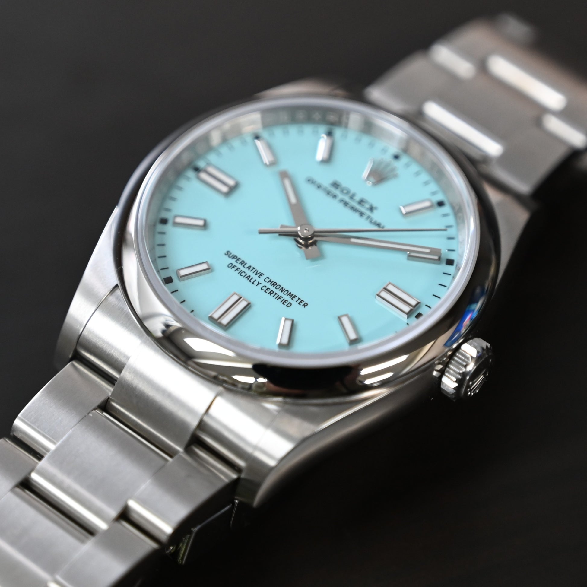 ヴィヴィットカラーでも最も人気の高いターコイズブルー ロレックスの最新の技術とクラフトマンシップの融合で制作される独特の文字盤は真鍮のプレートに6層のラッカーが重ねられ最後の工程にニスを塗り上げる芸術的な作品でもあります。保証書は2024年 付属品 完備 ブレスレットも未調整の新品