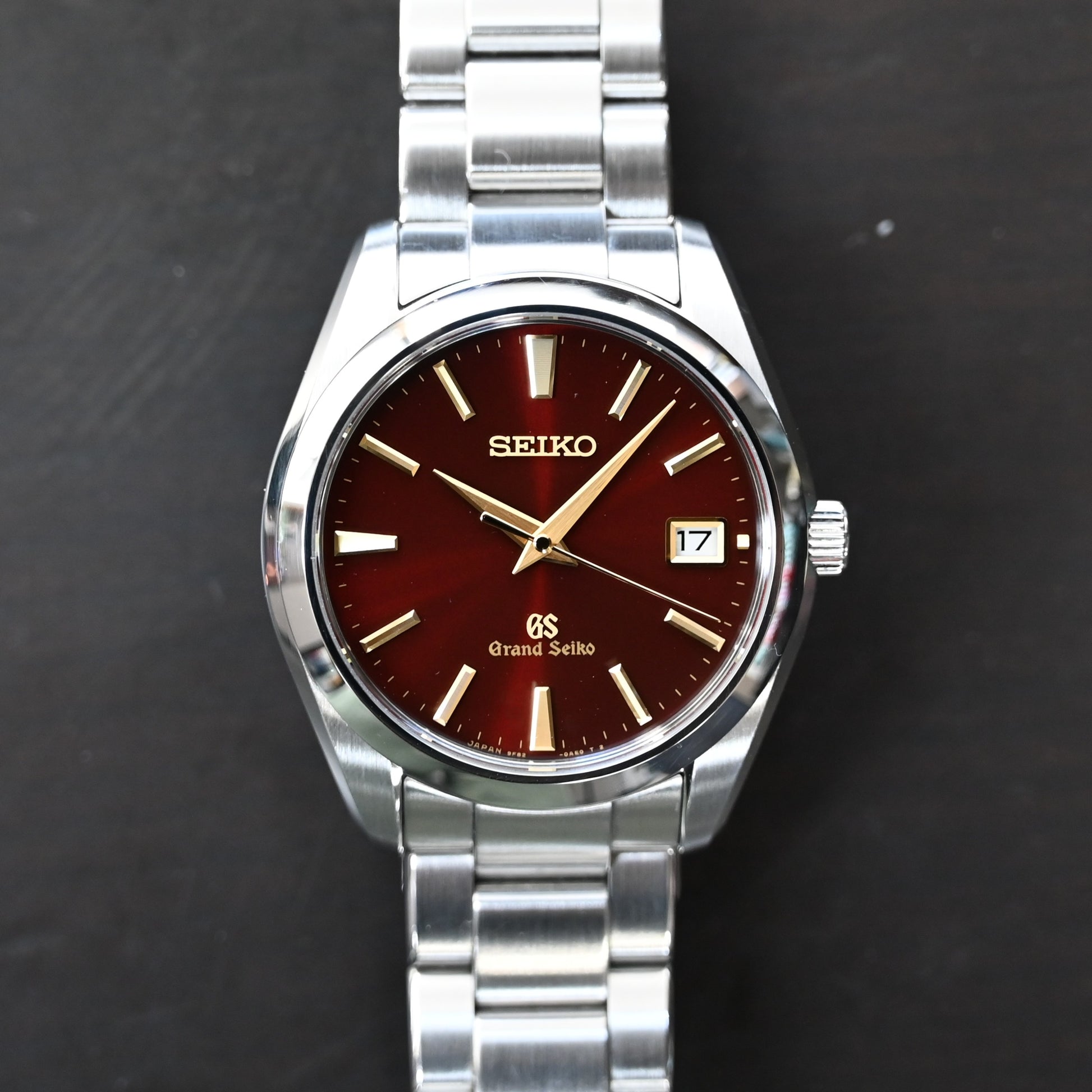 グランドセイコー世界限定500本 ボルドー文字盤の希少品 GSロゴが文字盤下部にある旧タイプ こちらのGSロゴ位置を好む方も少なくない。信頼のある9F62は年差±10秒を誇るキャリバー搭載 全体的に小傷はありますが 大きな傷はありません。 ケースブレスレットはクリーニング済